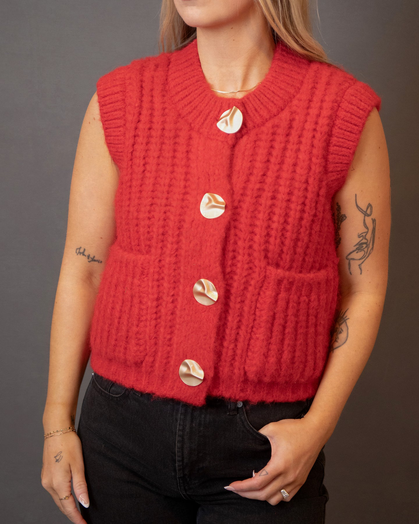 Make a bold statement this holiday season with the Savoya Sweater Vest by Velvet Heart. This gorgeous red sweater vest features eye-catching oversized gold buttons down the front, adding a touch of glamour and festive flair to any outfit. Perfect for layering over your favorite tops or dresses, the Savoya Sweater Vest brings warmth, style, and a pop of color to your holiday wardrobe. Stand out and celebrate in style with this stunning piece!