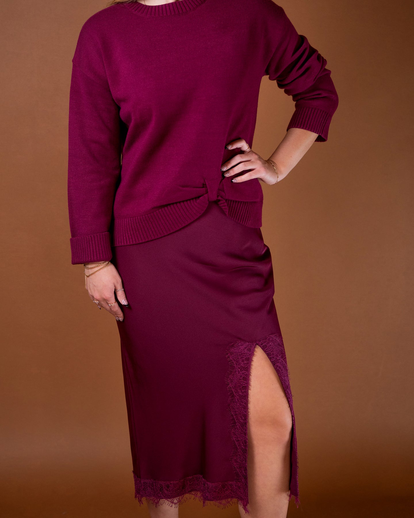 Elevate your fall wardrobe with the Tara Dress by Zoe and Claire. This stunning burgundy mixed media dress features a cozy long sleeve sweater top with a stylish side knot, seamlessly flowing into a sleek slip-style skirt. The rich color and unique design create a flattering silhouette that's perfect for special occasions or everyday sophistication. Step out in confidence and comfort with the Tara Dress—a modern classic for the season.