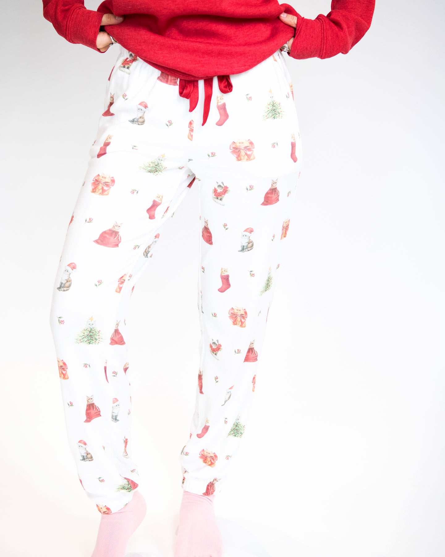 Add a touch of holiday whimsy to your sleepwear with the Festive Feline Pajama Pant by P.J. Salvage! These ivory cuffed pajama pants feature adorable prints of cats peeking out of presents, cozying up in stockings, and playing around Christmas trees. Soft, comfy, and filled with festive cheer, they're perfect for cat lovers and anyone who wants to celebrate the season in cozy, playful style. Snuggle up and let the festivities begin with the Festive Feline Pajama Pant!